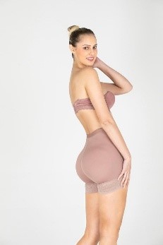 Microfiber shaping short with strong lower tummy control through front hook closure. Designed to cinch the waist, featuring silicone grip at the waist with wide lace trim, invisible internal butt-lifting effect, sits at the waistline, and includes a perineal zipper closure.