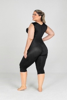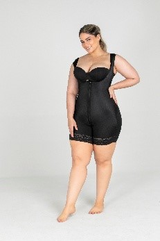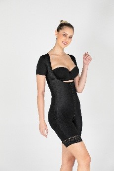 High-compression post-surgical microfiber garment with front zipper or hook closure, wide straps with sleeves, built-in enhancing bra support, and short with invisible internal butt-lifting effect.