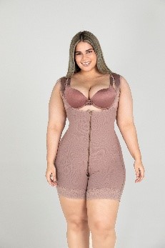 Faja de microfibra postquirúrgica de alta compresión, lleva cremallera o broches en abdomen, tira gruesa en hombro, pesquera hasta la rodilla, levanta cola interno invisible.